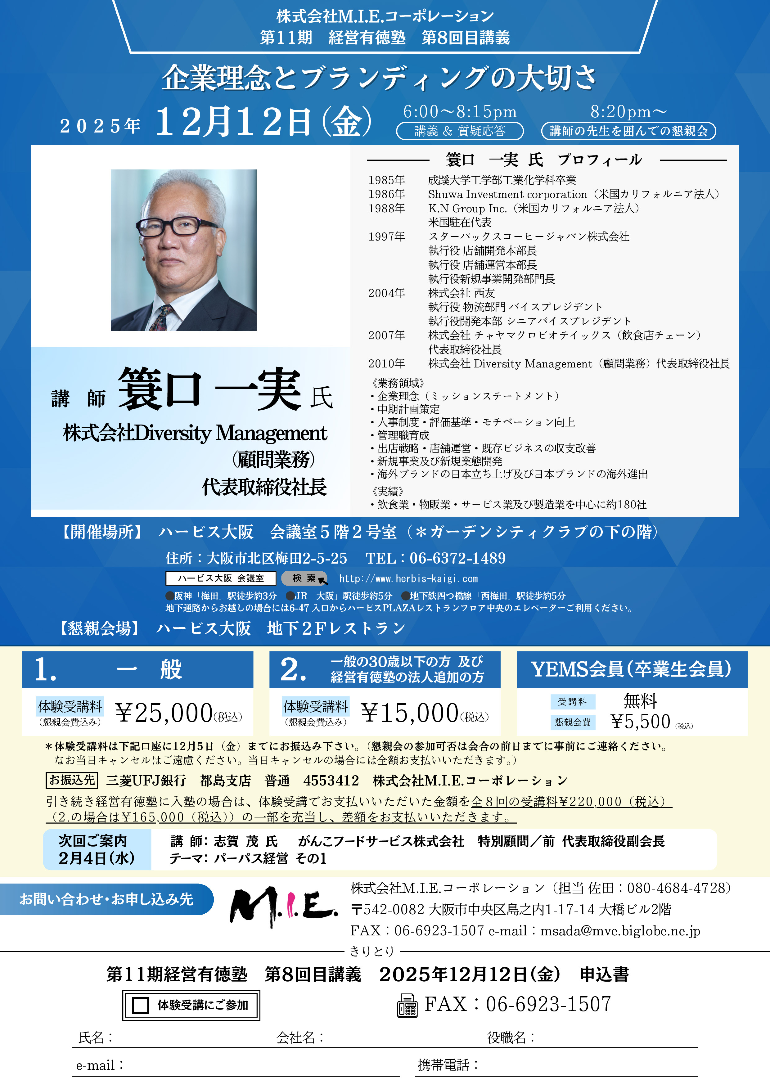 2.体験受講料:33歳以下の方、MIE会員・マドンナ会員:¥15,000(懇親会費込)